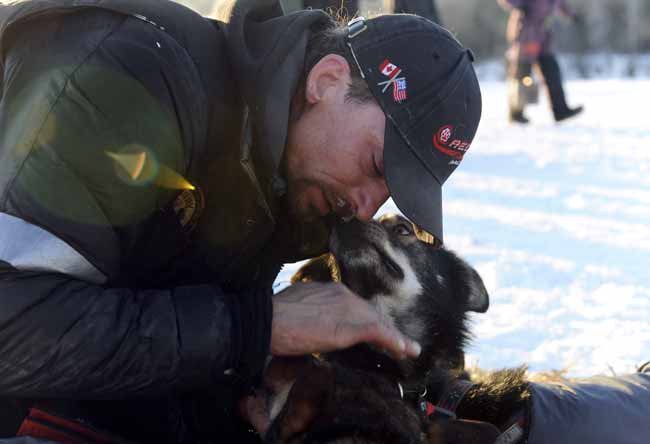 There is more to be said about the histories of imported diseases, colonial mining operations, and national amnesias in Alaska, but for now, let’s salute the heroes of the trail, the dogs who love to run and their humans who love their dogs. The following is a picture of four-time defending champion Lance Mackey and one of his beloved runners: