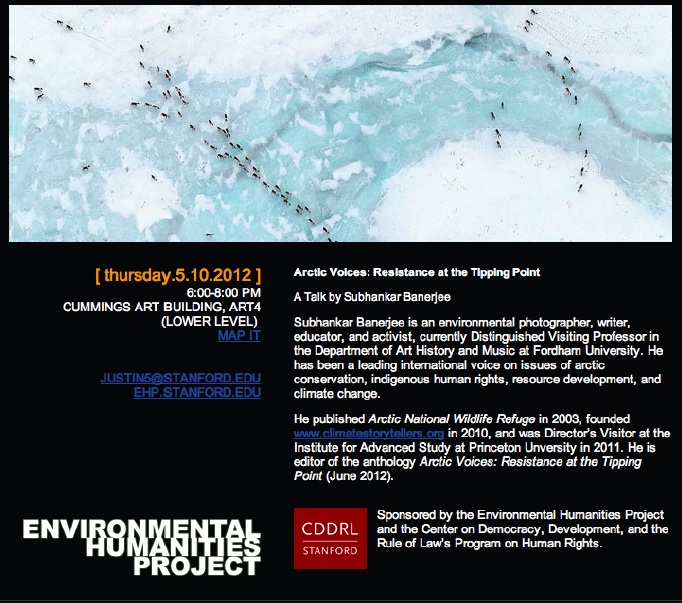 If you happen to be in the Bay Area next week, stop by Stanford University for a talk by climatestorytellers.org‘s Subhankar Banerjee (I previously mentioned Banerjee and his work here).